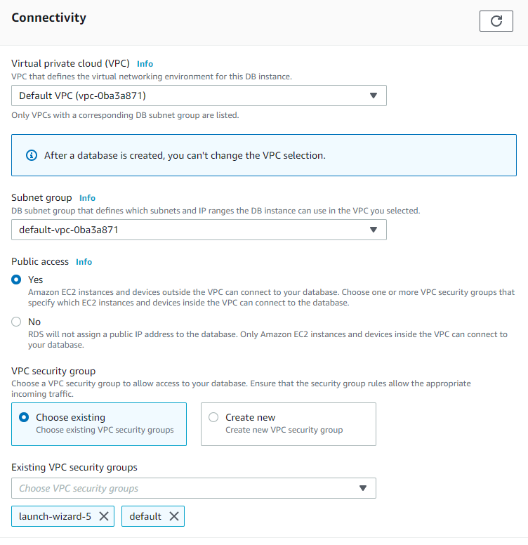 그 밑에 conntectivity은 Public access는 Yes로 설정하고 Choose VPC security groups에 해당 보안 그룹을 넣습니다.