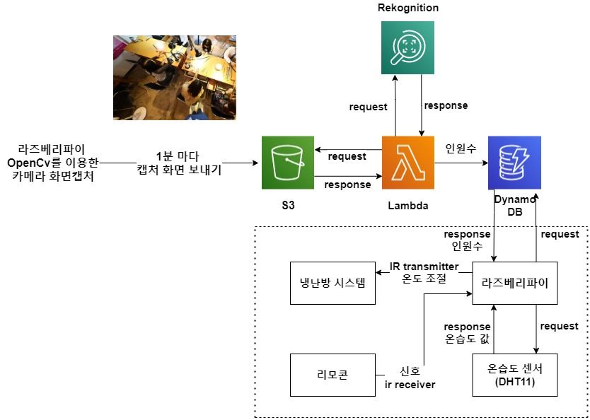 '으잉?🤔 한명만 있는데 에어컨이 빵빵이네? 환경오염이 심하겠는데? 사람 수에 맞춰서 온도 조절해주면 안 되나?'라는 생각을 가지게 되었고 여기서 '인원수에 기반한 냉난방 제어 시스템'을 생각하게 되었다.